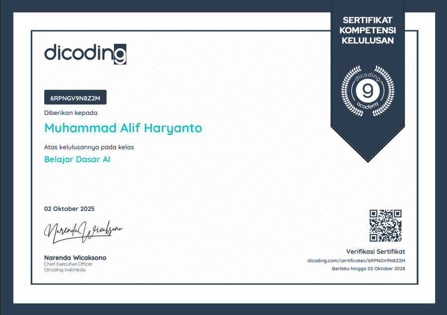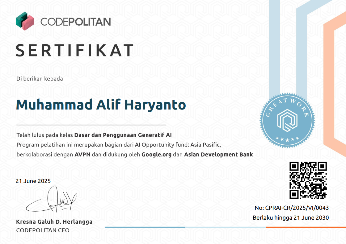 Hello, my name is Muhammad Alif Haryanto, usually called Alif. I am 16 years old and currently an active student at Wirabuana Vocational High School (SMK), majoring in Software Engineering. I have a strong interest in information technology, especially software development, coding, and artificial intelligence (AI).