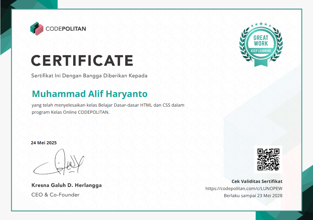 My interest in coding began when I was in 9th grade at Citayam Plus Junior High School. Even though programming was not part of the school curriculum, I started learning independently through articles, documentation, and various online resources. This experience strengthened my passion for technology and motivated me to continue my education in the Software Engineering field.